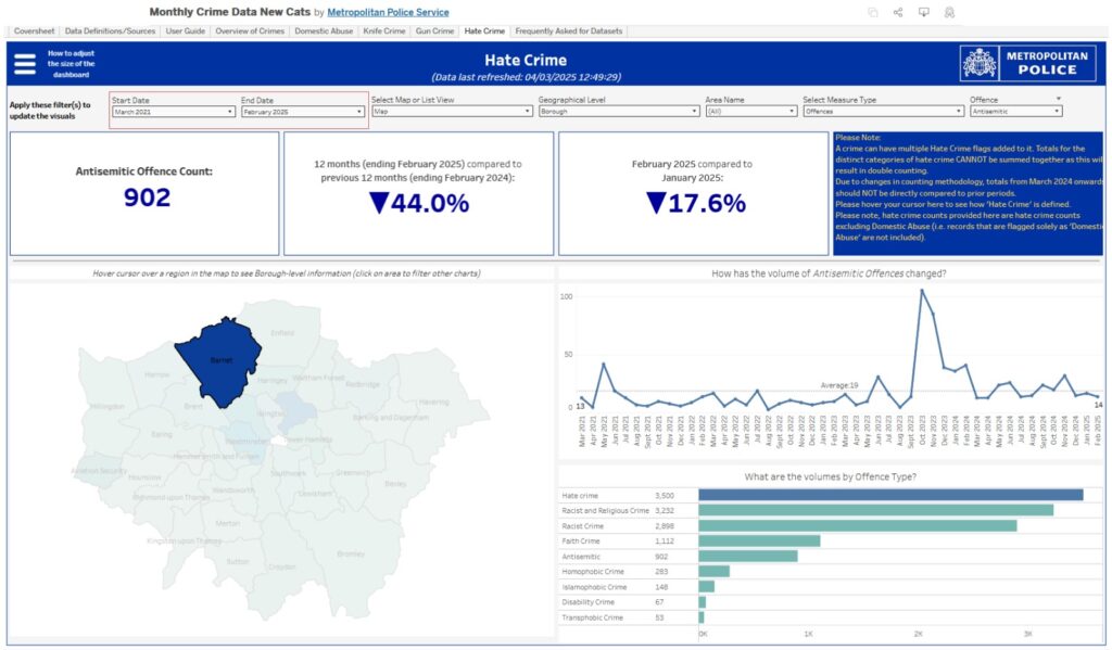Between March 2021 and February 2025, the Metropolitan Police recorded 902 antisemitic offences in Barnet.